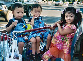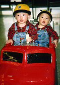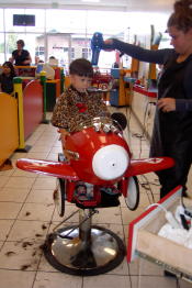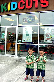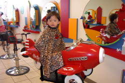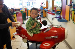 普段はパパが双子の髪を切っていたが、夏だから短くしようと思い、子供専用の美容室に行った。 店の中は子供の遊び場やテレビゲームが置いてあったり、イスは飛行機や車の形で子供も大喜び。 アメリカには、こんな子供専用の美容室がよくあります。