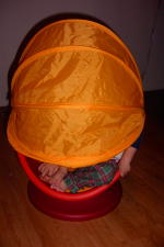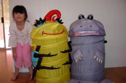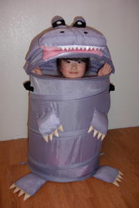 | 大きいおもちゃ箱があるとお片づけが楽です。 これはクリアランスセールでゲットした物ですが結構使えます。 使わない時は小さくたためるので便利だし、レベッカは中に入ってモンスターズインクのブーの真似をして遊んでいます。 でも最初、弱虫で臆病な双子達は、大きい虫のおもちゃ入れが怖くて近づけませんでした。 |
