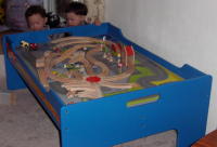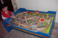 た。レールも電車も木で出来ていて結構良い物らしいが、日本のプラレールのように電池で動く物ではなかった。 最初は床に設置してみたが、どうしても邪魔になる。そこで探したのがトレインテーブル。 すごく大きいが収納引き出しも付いてるし、レールは出しっぱなしでも散らからなくて便利です。 |
