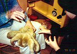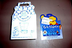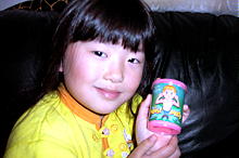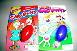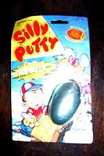 これは、シリー・プッティという子供のおもちゃです。 卵みたいな容器の中に、ねんどのような物が入っています。昔からあるおもちゃで、パパはもちろん、グランパも子供の頃遊んだそうです。 遊び方はねんどみたいに何かを作ったりしますが、時間がたつと元の形に戻ります。その他に、長〜く引っ張って(切れないから楽しい)遊んだり、丸めてボールを作ってスーパーボールとして遊んだり、絵とか字に押し付けて写して遊んだりもします。 |