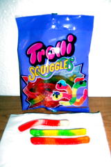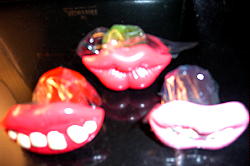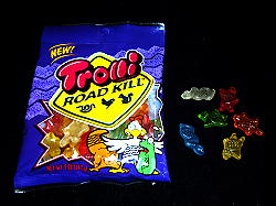 アメリカには面白いグミが沢山あります。アメリカのグミは日本のグミに比べて、基本的に硬くてまずいです。日本でも売っているミミズのグミは紹介するまでもないのですが、知らない人には面白いと思うのでご紹介します。 最初の写真(一番上の左)の『ROAD KILL』というグミは、車にひかれた動物の形のグミです。最低なお菓子だと腹が立ち、日本の皆さんに紹介しようと買いましたが、こういう商品を考えた人の人格を疑ってしまうし、商品化にOKした菓子メーカーの上層部にもあきれてしまいます。でも、動物愛護団体からクレームが出て、製造中止になるらしいので、今に幻の一品?になるかもね。 唇の形の物は、ガムのようなグミのような物で全部食べられます。