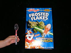今、スターウォーズエピソード3 が話題!(日本では7月ロードショー) 町中にたくさんのスターウォーズグッツが溢れているが、これはシリアル のおまけで1箱に1個入っている『セイバースプーン』です。 押すと光り、まるでライトセーバー気分!? |